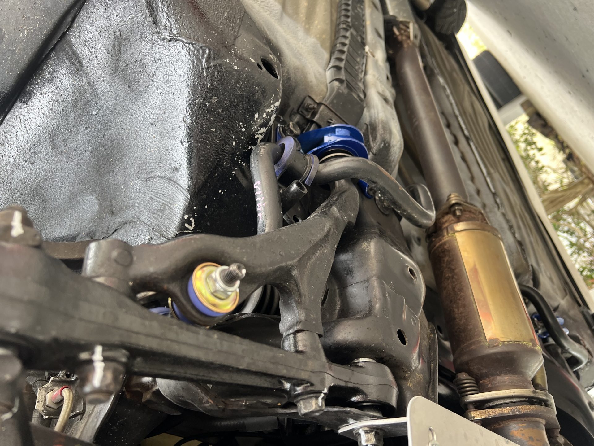 純正ブッシュをピロボールに置き換え、ブッシュのたわみやねじれを減らし、ハンドリング性能を向上させます。