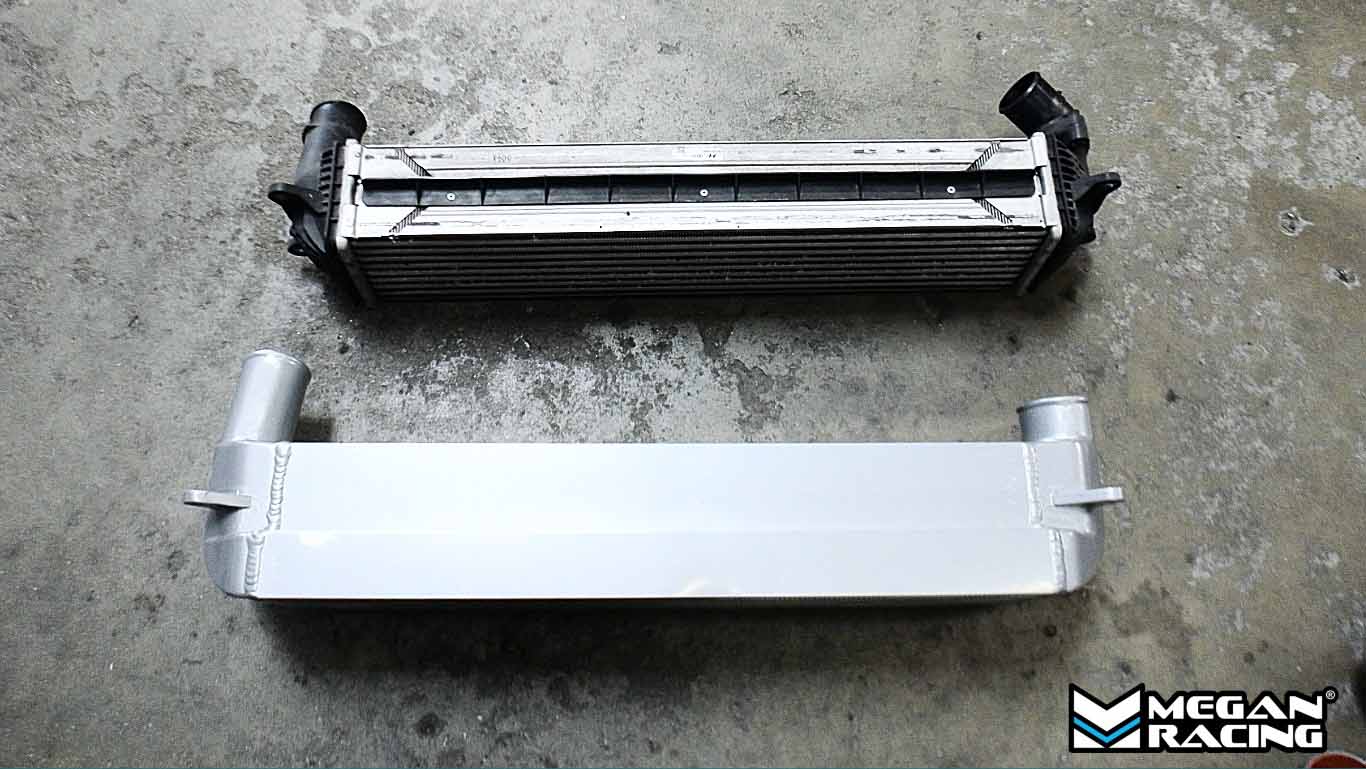 MEGAN RACINGの大容量インタークーラーは純正よりも大きなコアを採用し、吸気温度を効率よく低下。
